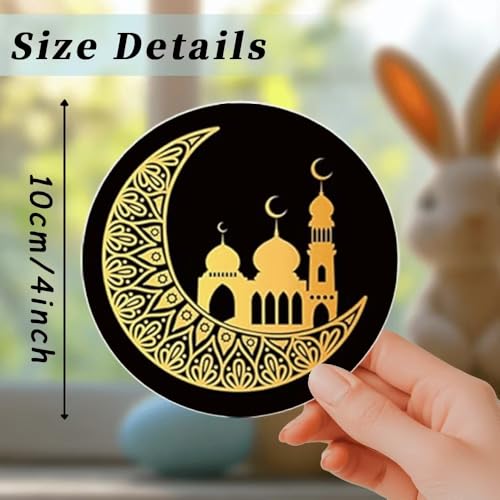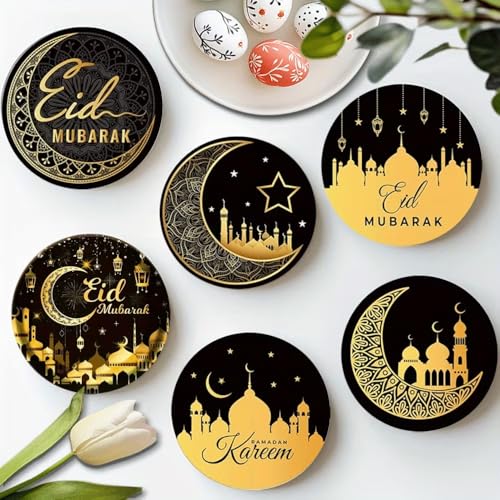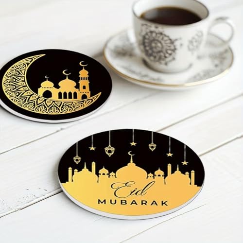 Generic - كوسترات ديكور عيد مبارك ورمضان كريم، تصميم إسلامي بالقمر والمسجد، mdf أسود وذهبي، دائري، 10 سم، 6 قطع