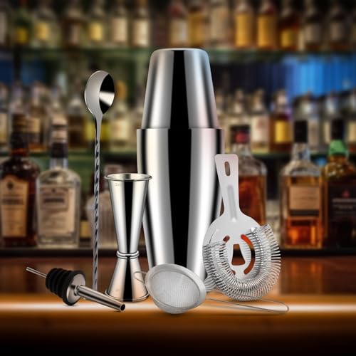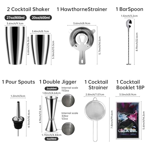- FULL BAR SET YOU NEED: This 7 piece cocktail shaker set includes all the bartender accessories:2 cocktail shaker 27OZ & 20OZ /800ml&600ml, a double Jigger 15ml 1/2oz,30ml 1 oz, a hawthorne strainer, a mixing spoon, a liquor pourers,a cocktail stiainer Help you create drinks made from a wide variety of liquors like Whiskey, Tequila, Gin, Rum, Brandy, and more.