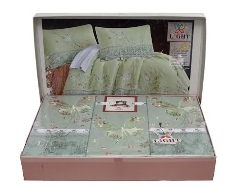 - Jewel 4 Pcs Sheet Set , Fitted Sheet 240x260+ 2 Pillow Case 55x70+ 1 Pillow Case 160x45, Embroidered 100% Cotton Preshrunk 100% Cotton , "Olive" - 18536