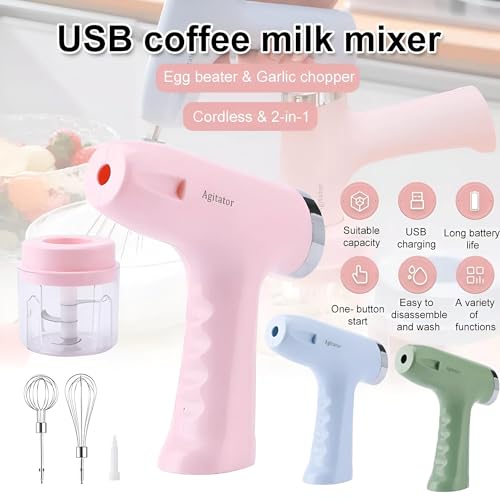 - This 3-in-1 electric eggbeater comes with a USB port and multifunctional attachments including a garlic grinder, food chopper, and handheld blender, making it versatile for various kitchen tasks and available in multiple colors, offering convenience and style.
