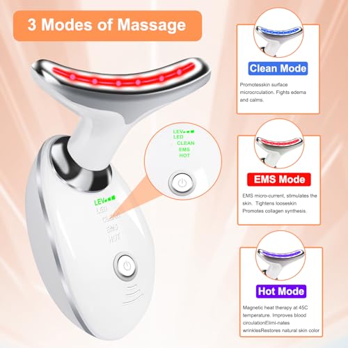 - 【3 Modes of Massage】This neck and face massager has 3 modes to meet your different needs. Clean Mode, EMS Mode, Hot Mode. Improve circulation and promote the growth of fibroblasts and collagen. Personalised Facial Soothing Solutions for Users.