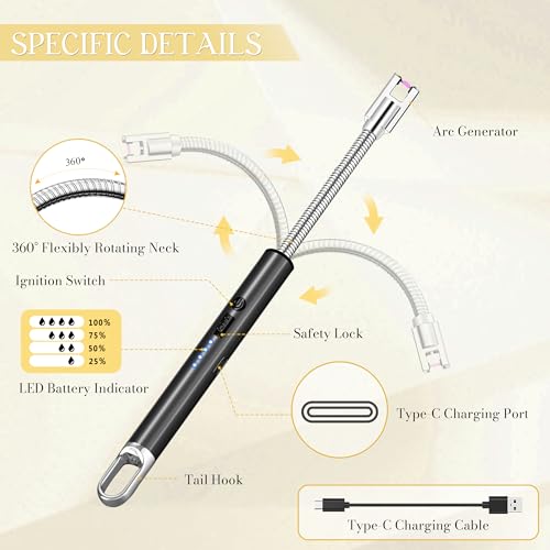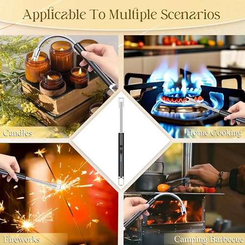 - [MERGES AESTHETICS WITH FUNCTIONALITY]- The slim design and bright colors make electric lighters more compact and exquisite. Its 360° flexible neck allows electronic lighter to stay away from the flame for flexible ignition. The tail hook design makes storage and use more convenient. Unlike traditional lighters, rechargeable lighter for candles adopts a flameless, oil-free and smokeless design, avoiding pungent odors and ensuring safety.