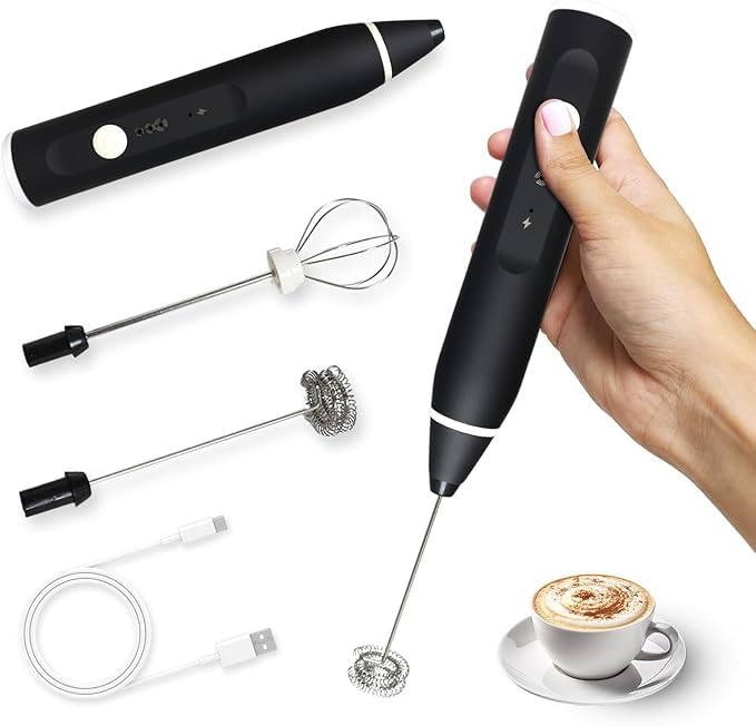 Generic - Electric Milk Frother Rechargeable, Black, with 3 Whisk Heads, USB Cable, for Coffee and Cappuccino (Multicolor)