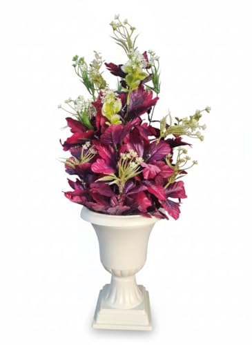 - Elegant Artificial Flower Vase - Vibrant Purple and Green Flowers in a Classic White Vase - Home, Office, or Occasion Decor