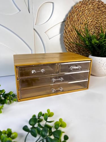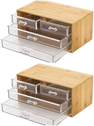 Generic - منظم مكياج ومجوهرات انيق من الخيزران مع ادراج اكريليك شفافة، صندوق تخزين صغير متعدد الاستخدامات لطاولة الزينة والحمام والمطبخ (عبوة من قطعتين)