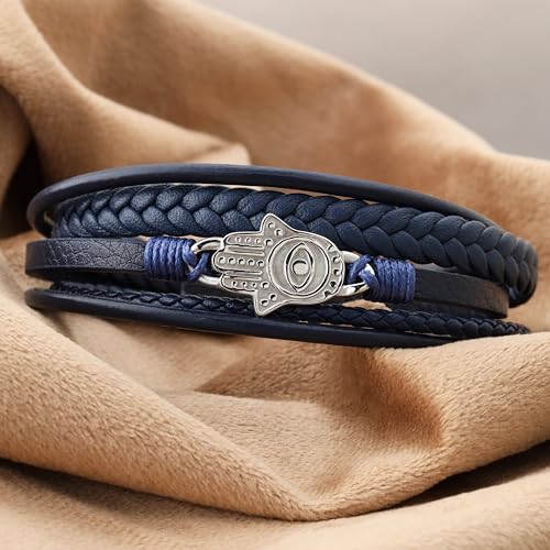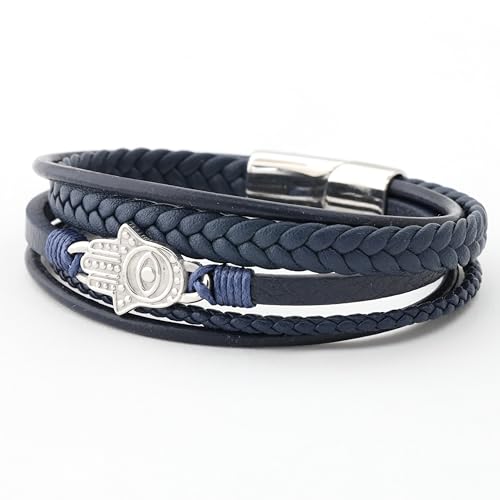 Elegant Bear - Silver Karma Blue Genuine Leather Bracelet, Braided Design with Metallic Accent