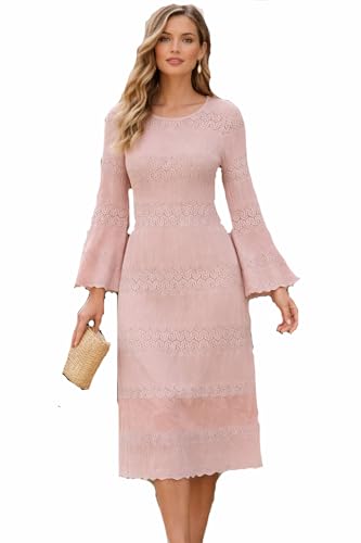 Generic - Elegant Blush Pink Knee-Length Lace Dress for Women – Bell Sleeves, Slim Fit, Size S (Thomas & Splendor)
