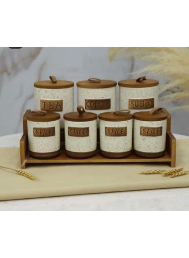 Generic - Elegant Kitchen Storage Utensil Set, 7 Pieces with Wooden Stand, White and Brown, for Coffee, Tea, Sugar, Spices, with Multicolor Wooden Lids