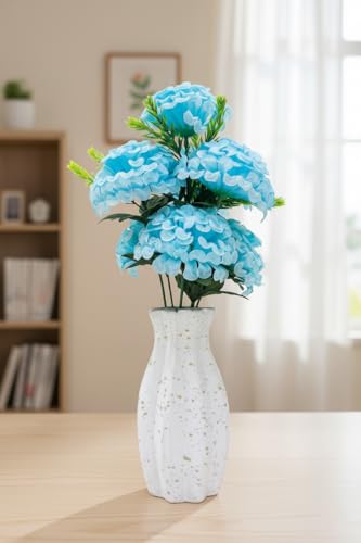 باقة زهور صناعية أنيقة بلون أزرق سماوي نابض بالحياة بتصميم الهيدرانجيا في فازة سيراميك عصرية بيضاء مزخرفة بالذهبي - ديكور منزلي مكتبي فريد ولمسة هادئة للمنزل أو المكتب
