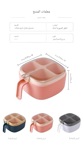 - تم تصميم مجموعة حاويات التوابل 4 في 1 هذه لتعدد الاستخدامات في المطبخ، حيث تجمع بين التخزين والعملية لتلبية جميع احتياجات تنظيم التوابل. تسمح لك الأقسام الأربعة بتخزين مجموعة متنوعة من التوابل بشكل أنيق، مما يجعل من السهل إضافة النكهة المثالية إلى أطباقك بضغطة واحدة.