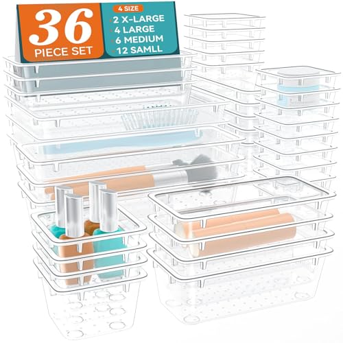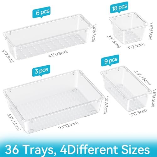 ElegantArray - 36 PCS Drawer Organizer Set, 4 Sizes Tool Storage Trays, Clear Plastic Makeup Vanity Organizer and Storage Bins for Makeup, Stationeries, Multiple Gadgets for Bathroom, Office, Bedroom