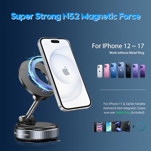 - شفط مطور وقوة مغناطيسية: يتميز بكوب شفط مفرغ يتم تثبيته بإحكام على أي سطح أملس (الزجاج الأمامي للسيارة ولوحة القيادة وجهاز المشي والمكتب) وحامل هاتف مغناطيسي قابل للتعديل بزاوية 360 درجة للسيارة مع مغناطيسات معززة للمحاذاة التلقائية الفورية. حامل هاتف السيارة هذا يحمل الهواتف بأمان حتى على الطرق الوعرة، مما يجعله قاعدة تثبيت موثوقة للتثبيت بالشفط للتنقل اليومي.