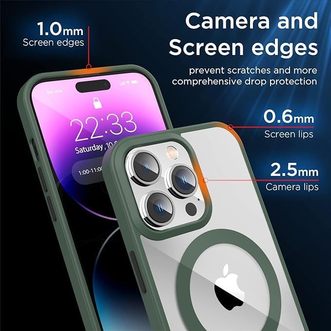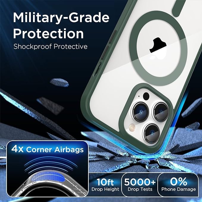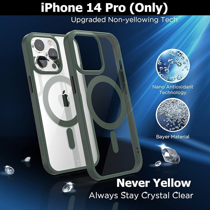ELMO3EZZ - جراب حماية مغناطيسي رفيع ممتص للصدمات لموبايل ايفون 14 برو مع ماج سيف [مغناطيس قوي] [لا يصفر] [حماية من الدرجة العسكرية] [جديد 2023] الموعز ابل اخضر الباين شفاف .