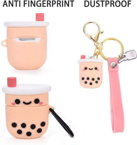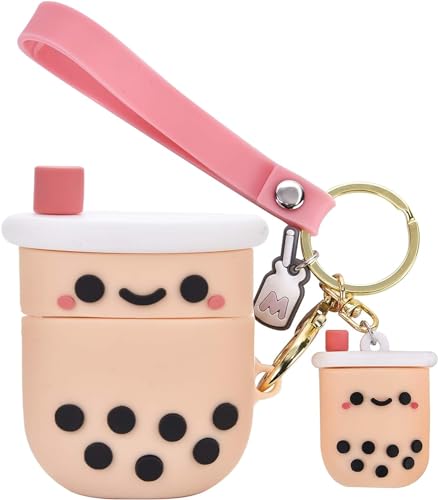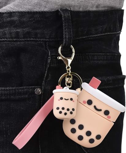 ELMO3EZZ - جراب لطيف لسماعات ايربود مع سلسلة مفاتيح بتصميم بوبا ميلك تي متوافق مع سماعات ايربودز 2 و1 للنساء والفتيات من الموعز، سيليكون، زهري