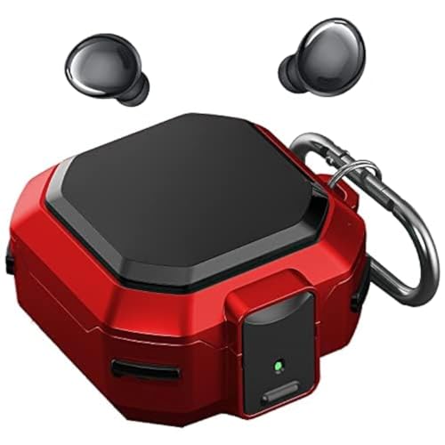 ELMO3EZZ - حافظة حماية من الموعز [قفل امن] لجالاكسي بادز برو / حافظة بودز لايف / حافظة جالكسي بادز 2، حافظة حماية متينة لكامل الجسم للرجال والنساء مع سلسلة مفاتيح لسماعات اذن سامسونج - اسود/احمر، البوليستر