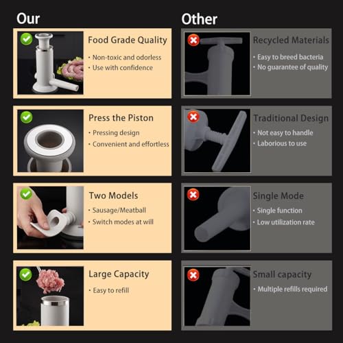 - Food Grade Material: The Sausage Making Machine Body Is All Made Of High-Quality PP Material And Stainless Steel, Can Be Directly Contacted With Food. Non-Toxic And Odorless, Non-Slip And Non-Displacement, Which Is More Safe To Use.