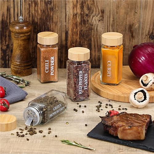 - ✅High Quality Materials: The square spice jars with labels with labels are made of high quality glass. The matching lids are made of natural bamboo. Size of each glass spice jars: approx. 1.65in wide and 4.33in high (including bamboo lid). Highly transparent glass seasoning jars with a variety of spices at a glance.Empty spice bottles with labels are a must for a new house.
