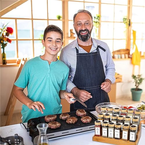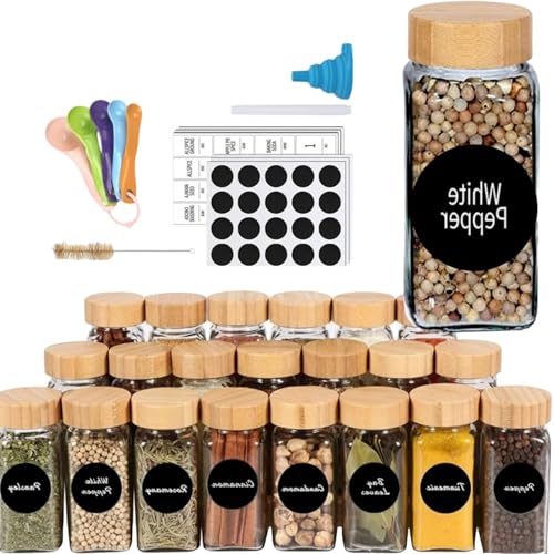 - ✅Neat and Organized: Want to say goodbye to messy spice packages and cluttered kitchens? Our spice bottles empty glass with labels is perfect for you! It fits any spice rack, cupboard, organizer, drawer or kitchen. The bamboo lid spice jars makes a variety of spices more neat and beautiful to display in your kitchen. It is also perfect for housewarming gifts and birthday gifts. If you have any questions about the product, please contact us and we'll be the first to solve it for you!