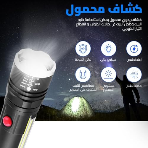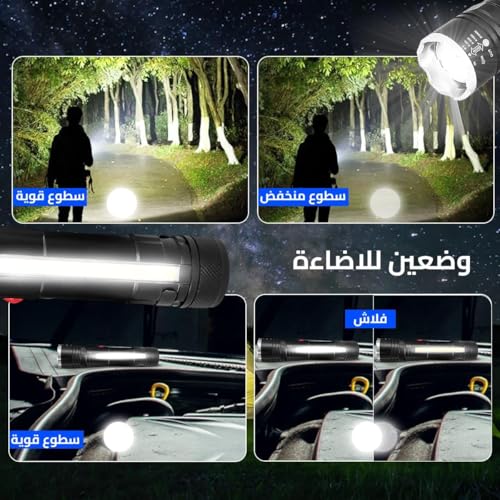 - ضوء طوارئ فائق السطوع لليالي المظلمة عندما تنطفئ الطاقة فجأة، يحول هذا الضوء فائق السطوع الفوضى إلى هدوء. مصباح يدوي ليد قابل لإعادة الشحن يصدر شعاعًا قويًا ومركزًا بحيث يمكنك الاطمئنان على الأطفال أو العثور على الشموع أو الوصول إلى علبة الفيوزات دون الاصطدام بالأثاث أو تفويت أي درجة.