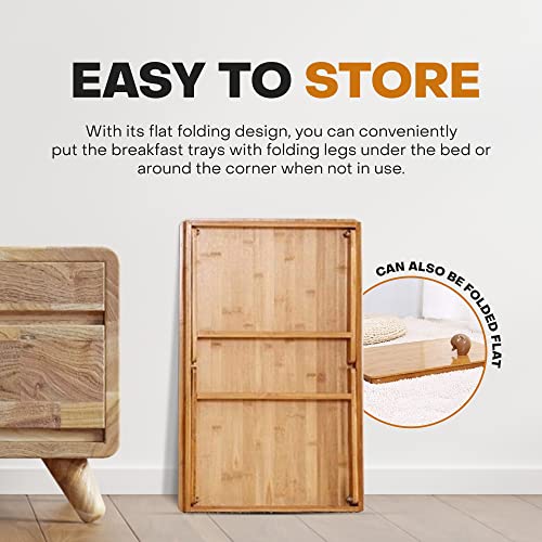 - SPACE EFFICIENT – With its flat folding design, you can conveniently put the breakfast trays with folding legs under the bed or around the corner when not in use. No need for installation, open it and use it after you got this product.