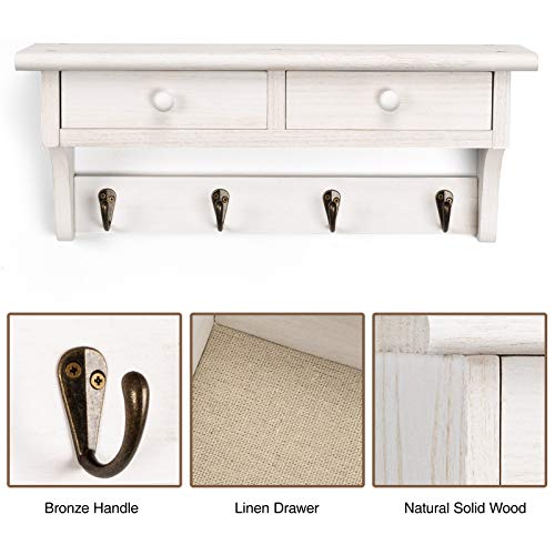 - RUSTIC COAT HOOKS WALL MOUNTED: Solid wood with white finish feature a rustic style and clear wood grain make this wall mounted coat rack with shelf more close to nature, simply and eco-friendly. Bring natural elegance on wall while adding functional storage space