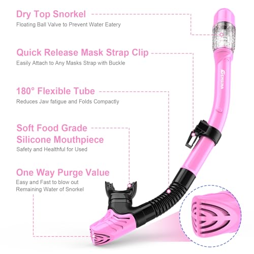 - DRY TOP SNORKEL WITH PURGE VALVE: The dry top valve eliminates water entry when submerged. A soft silicone mouthpiece drastically reduces jaw fatigue. The bottom purge valve available to blow out any remaining water. Adopting float valve at the top of breathing tube can completely seal to keep water out when under water and will open to let your breath easily when above water. One-way purge valve helps to clear out any water quickly. Fixed buckle attaches with the swim mask.