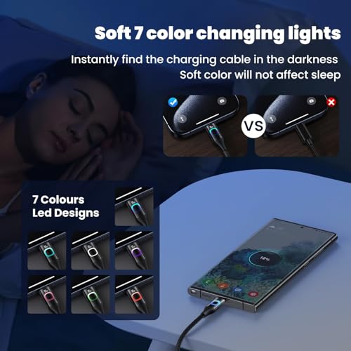 - [شاشة ليد ملونة] يأتي كابل البيانات مع ضوء ملون ناعم، مما يجعل الشحن أكثر راحة في الظلام. عندما تغلق عينيك، لن تشعر بأي ضوء، وعندما تفتح عينيك، يمكنك العثور على كابل الشحن بسرعة لا تقلق بشأن البحث عن كابل الشحن في الظلام بعد الآن، ولن يؤثر ذلك على نومك
