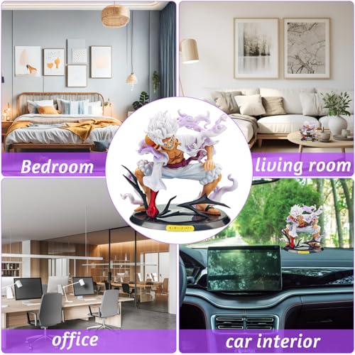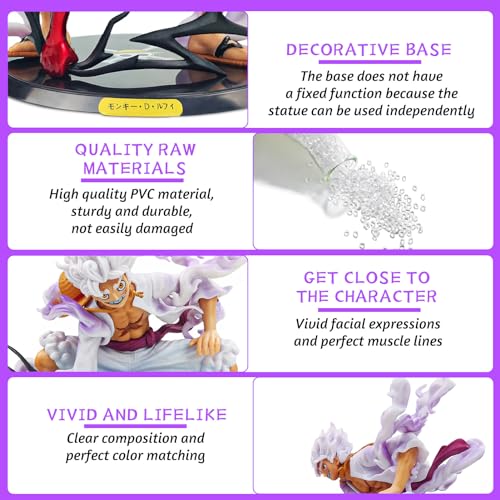 - High-quality material: Anime Luffy Gear 5 figure is made of high-quality PVC material, which is strong and durable and cannot be easily damaged. The base is for decoration only and has no fixing effect, as the Ruffy action figures ornament can stand alone.