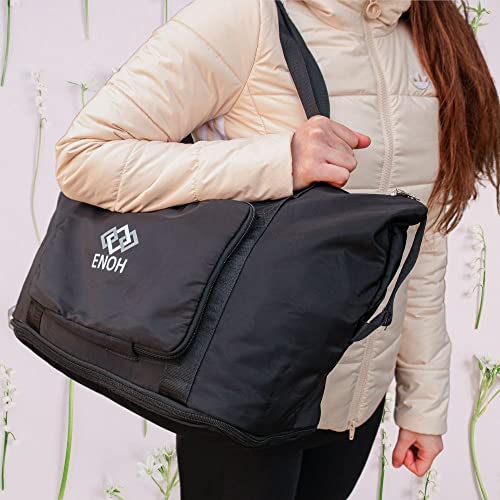 - Foldable Design The ENOH sports travel bag is lightweight and can be hung on your suitcase as an extra bag. Space is saved after folding and can be easily transported. The internal folding design allows the product more capacity and space. Dimensions: Normal size: 42 x 22 x 28 cm, Folded size: 28 x 18 x 4 cm. Extended size: 42 x 22 x 38 cm.