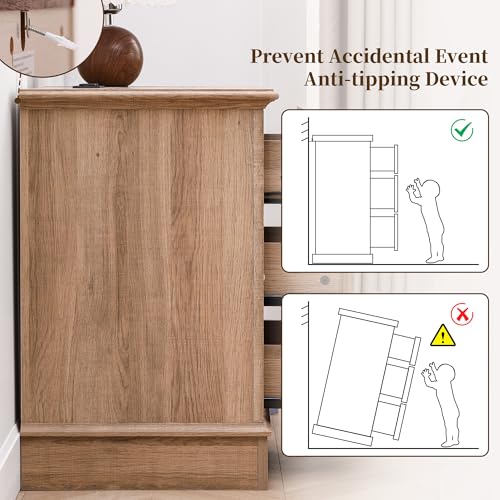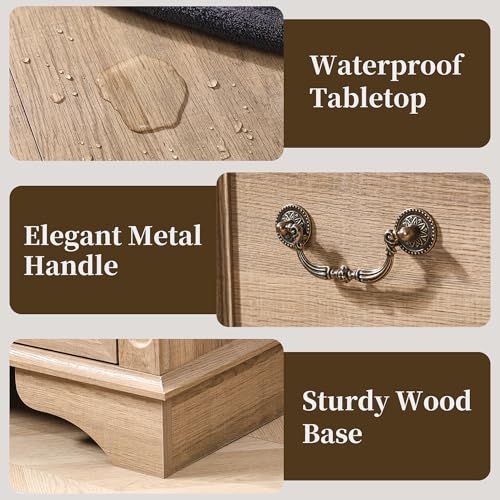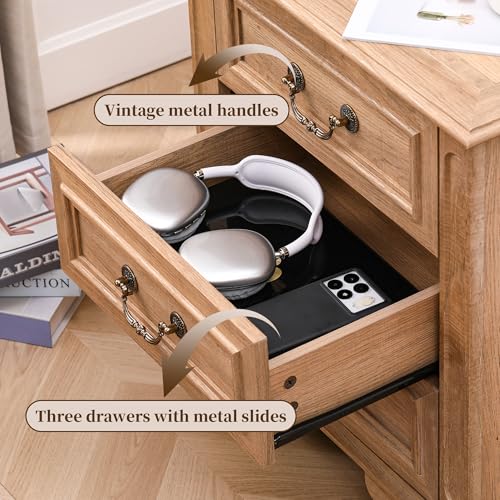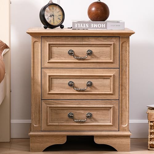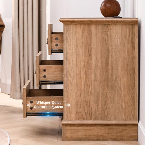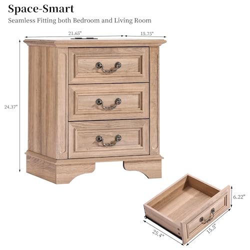 ENOUSHU - Farmhouse Night Stand with Charging Station, Bedside Table with 3 Drawers Storage and Outlets, Wood Nightstand for Bedroom, Living Room, Closet (Natural)