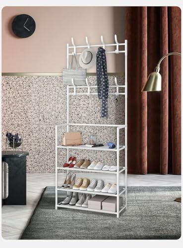Generic - Entryway Hall Tree with Shoe Rack, 155 cm Height, 4-Tier Storage Shelves, 8 Coat Hooks, White Metal Frame (WHITE)