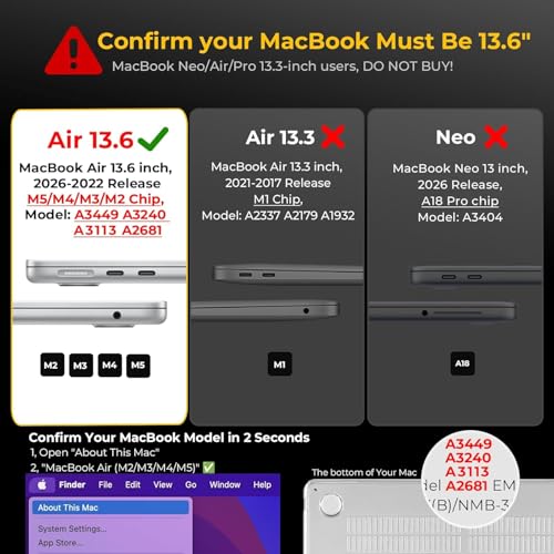 - Only Compatible for NEW M3 M2 Macbook Air 13.6 inch with Touch ID(Model:A3113 A2681, Released in 2022 2023 2024) Please check the Macbook model "AXXXX" on the back before purchasing. Not compatible with other Macbook model