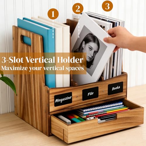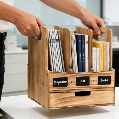 Eorbow - حامل خشبي للمجلات والمستندات للمكتب مع 3 مساحات تخزين ودرج واحد، منظم مكتب ورف مجلدات مع ملصقات للكتابة، صندوق تخزين للمجلات وفرز رسائل البريد للمكتب والمنزل من يوربو