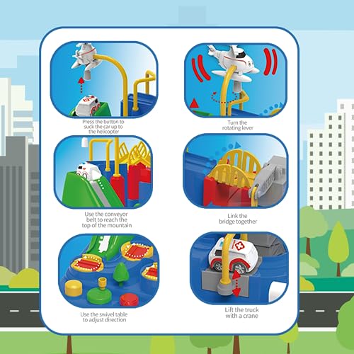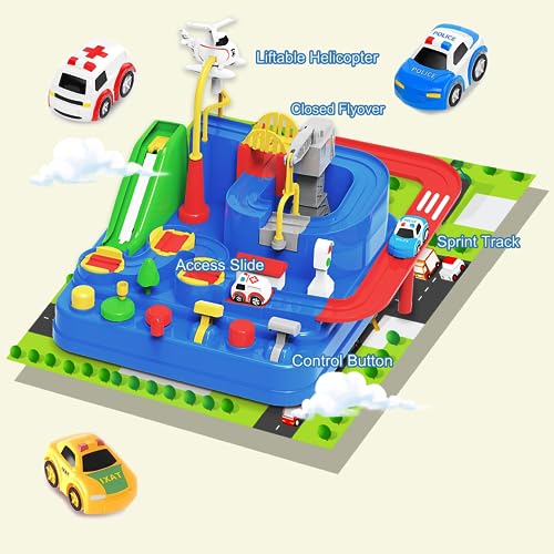 - Inimitable CHILDREN'S CAR TOY SET - EPPO Race track car adventure toy has the inimitable design, with 6 buttons and 8 different challenges, 3 mini cars: police car, ambulance, yellow taxi. It helps to train and improve children's motor skills and hand-eye coordination by guiding children through every obstacle and challenge.