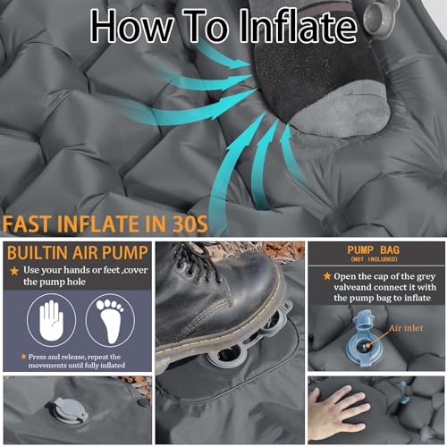 - 【سهلة النفخ】تأتي مرتبة التخييم الخاصة بنا مع منفاخ قدم مدمج، مما يسمح لك بنفخ المرتبة بسهولة بحركات قدم بسيطة. لا حاجة للفم أو اليدين أو المضخات الأخرى للنفخ، لذا فمرحبًا بالراحة. تتميز بتصميم وسادة هوائية مبتكرة توزع الضغط بالتساوي لضمان الحصول على راحة فائقة. يوجد أيضًا غلاف مضاد للتسرب داخل الصمام، لذلك لم يعد هناك ما يدعو للقلق بشأن تسرب الهواء عند استخدامه.