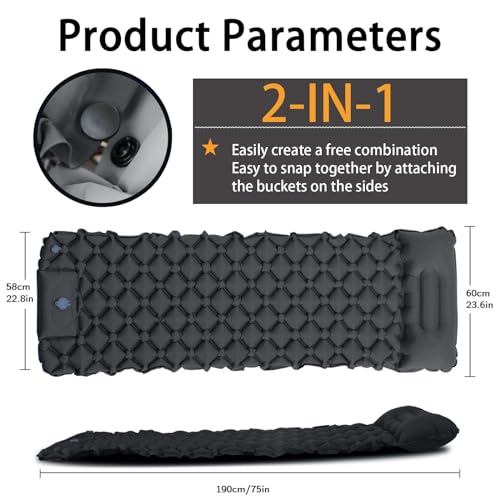 - 【تصميم متعدد الاستخدامات】تتميز مرتبة التخييم الخاصة بنا بتصميم زر جانبي فريد يسمح بتوصيل مراتب متعددة معًا. قم بتعديل حجم منطقة نومك من خلال توصيل وسائد متعددة بسلاسة. سواء كنت تخيم مع شريك أو مع مجموعة من الأصدقاء، فإن المراتب الهوائية الخاصة بنا توفر تنوعًا لكل احتياجات النوم في الهواء الطلق.