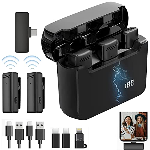 - 【Digital Display Charging Box】:Charging case with LED power Display shows remaining power in percentage from 1%-100% and you will clearly know the remaining battery at any time. Each wireless microphone can be used for up to 6-10 hours after about 1-2 hours charging.