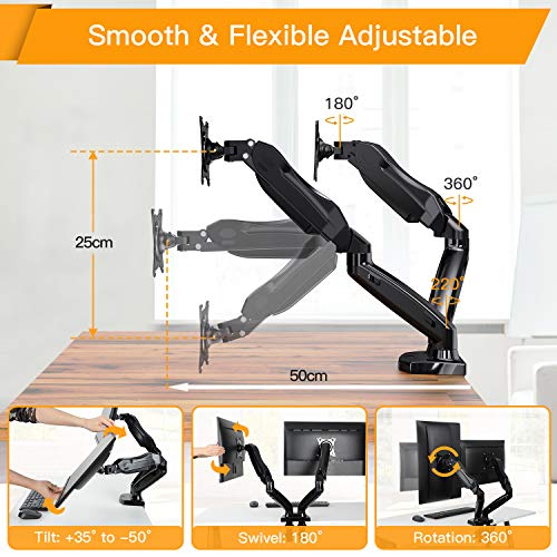 - ENJOY FULL MOTION FLEXIBILITY: Our dual monitor stand provides a full range of motion including 180° swivel, +80° to -45° tilt, and 360° monitor rotation. Each arm of the dual monitor mount can support up to 17.6lbs