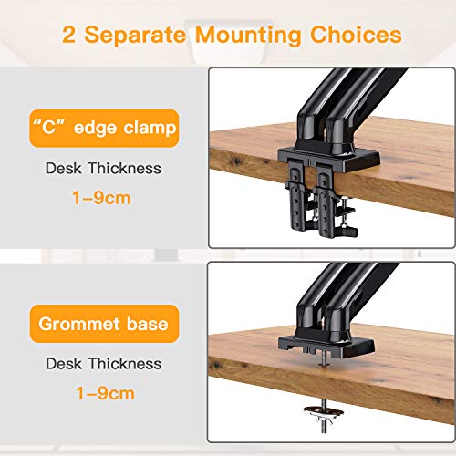 - EASY INSTALLATION: Install your monitor desk mount in 3 easy steps. Simply secure the base to your desk, attach the arms, then hang your monitors. Choose between C-clamp or grommet mounting for desks up to 3.15” thick.