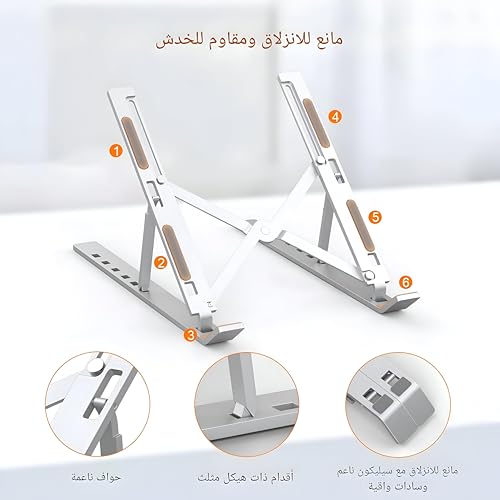 - The stand features a stable triangular support structure combined with non-slip silicone pads and raised feet to securely hold laptops of all sizes without sliding or tipping, even on smooth surfaces.