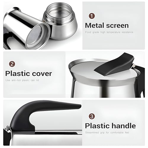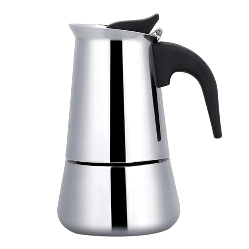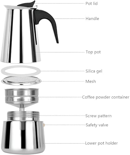 - [Stove & Induction Heat] - This moka pot is suitable for fire and induction cookers, electric oven, ceramic oven, alcohol oven, gas stove. The minimum coil diameter of the induction cooker must be greater than 8.5 cm. The base can turn black when it comes in with an open one. This does not affect the use.