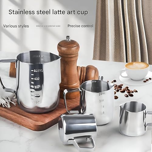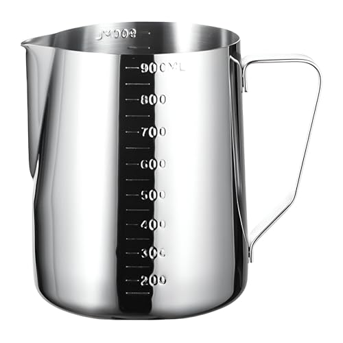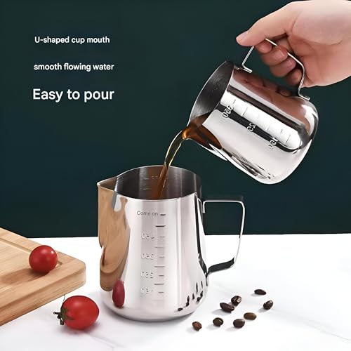 - Featuring a built-in internal measurement scale, this pitcher eliminates the guesswork by allowing precise control over milk or liquid volume while frothing. Whether you're creating a silky cappuccino or mastering latte art, it ensures consistently perfect pours every time.