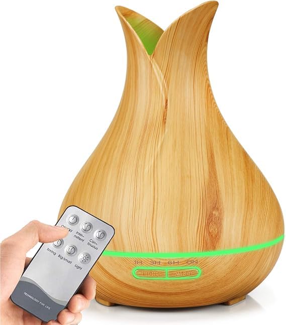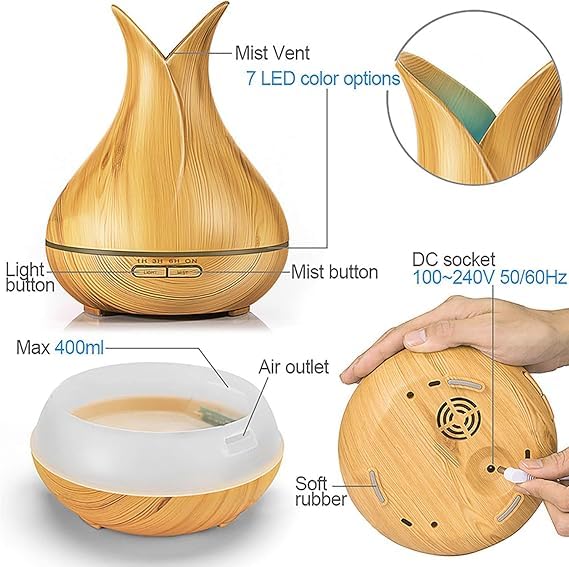 - This oil diffuser has 7 different color lights, which can be selected by the light button. We are offering a remote control. You can use it very easy. And you can adjust the continuous usage time, you can choose 4 time setting modes: 1h/3h/6h/constant