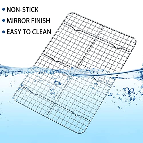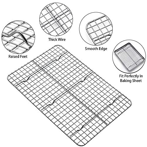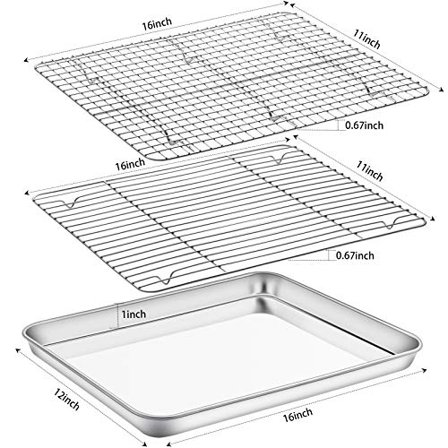 - 🍑【PERFECT KIT】This product has a total of 4 sets, including 2 baking trays 16 x 12 x 1 inch, a dense grid rack and a square row cooling rack 16 x 11 x 0.67 inch. It is very suitable for ovens and toasters. It is for baking bacon, chicken wings, The best choice for biscuit and cake making.