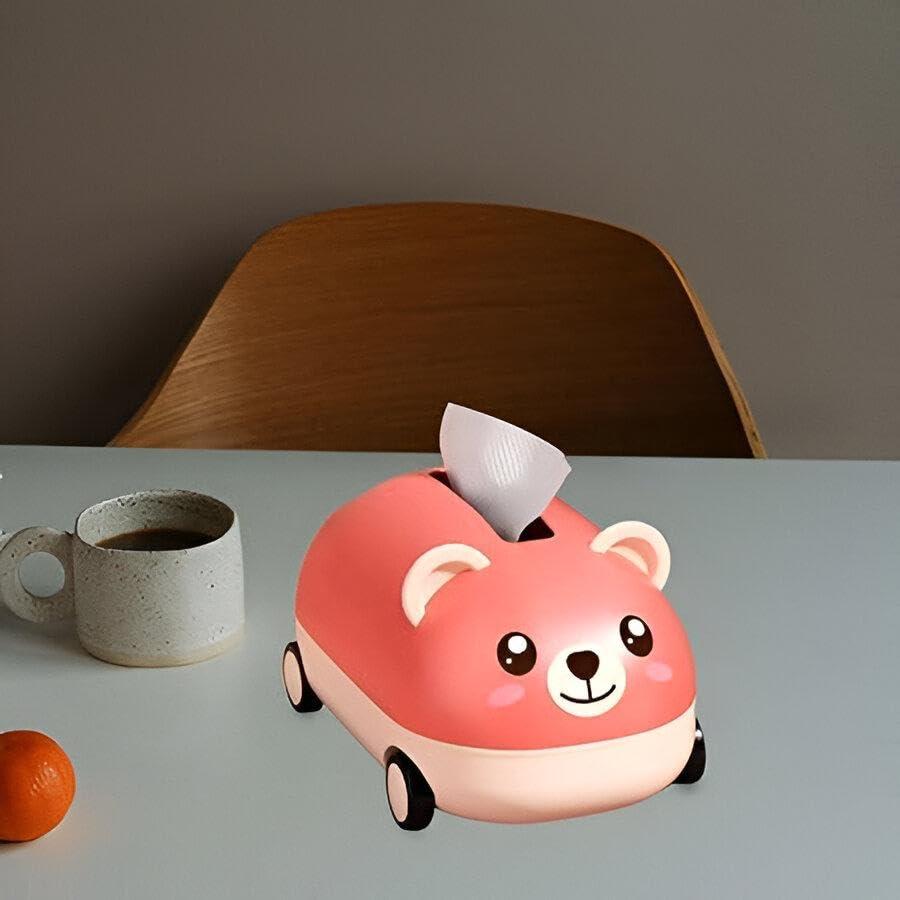 - This charming cartoon bear tissue box cover combines functionality with adorable design, providing a delightful way to dispense paper towels and add a touch of whimsy to any space. Crafted from durable plastic, this rectangular tissue box holder is not only visually appealing but also built to last, resisting damage and cracking for long-term use. Its compact size ensures it fits seamlessly on any table or countertop without taking up excessive space.