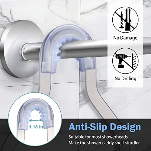 - 【Anti-slip Bathroom Organizer】With this anti-slip rubber on the top of the shower hanger and adhesive stickers, the hanging shower caddy remains stable even when the shower organizer over shower head is filled with items, which ensures you a better bath experience. The the anti-slip rubber protects shower racks for inside shower from sliding and scratching.