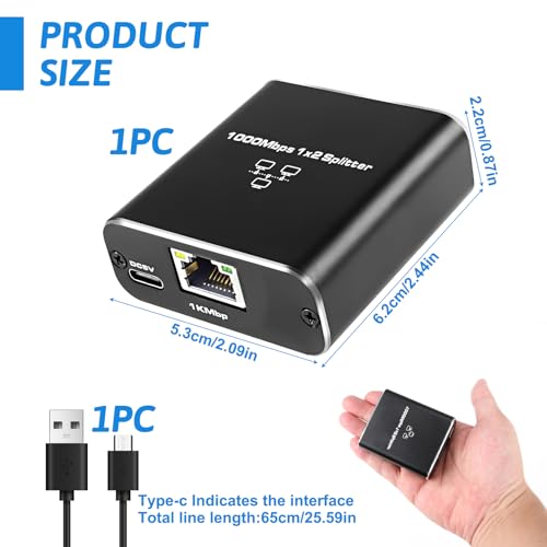 Cutekid - Ethernet Splitter 1 to 2 1000Mbps Ethernet Switch 2 Port Gigabit Network Switch Splitter with Type-C Power Cable for Computer Hub Switch Router ADSL Set-Top Box Digital TV, Support 2 Devices Working