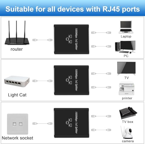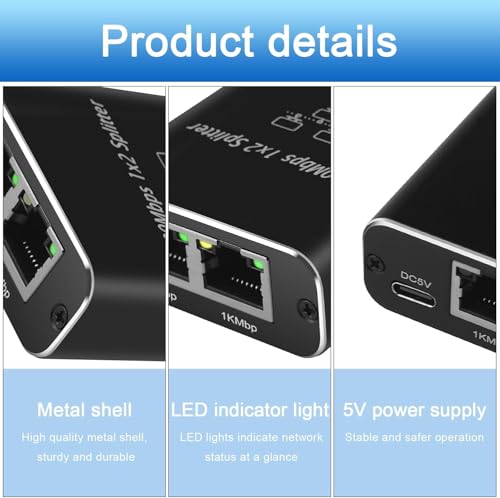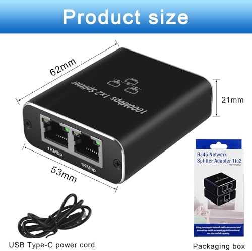 - Dual Ports: Split a single Ethernet connection into two RJ45 LAN ports for enhanced connectivity High-Speed Performance: Supports up to 1000Mbps for fast and stable internet access Wide Compatibility: Works with Cat5, Cat5e, Cat6, Cat7, and Cat8 Ethernet cables Plug & Play: Easy setup with no installation required – just plug it in and go Compact & Efficient: Perfect for home, office, or gaming setups requiring additional Ethernet ports