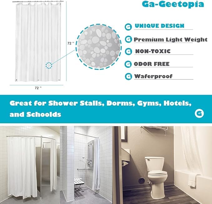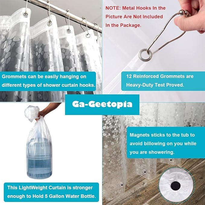 - Good Quality - Made From 3.2 Gauge Hight Quality EVA Material. This Shower Curtain Liner is Thin(Light Weight) but Strong with no plastic smells. Each Curtain Has passed our Weight Test in Ga-Geetopia Lab, which can hold up at least 5 Gallon watter Bottle. This Premium Light-Weight shower curtain liner will create a better Bathroom for you and your family. Get A Pair of Our Ga-Geetopia Shower Curtain Liner to find out!