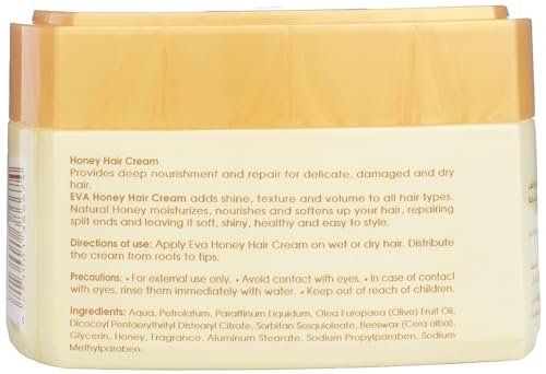 • A perfect formula that penetrates hair follicles to moisturize, nourish and soften your hair. Eva Honey Cream prevents split ends and restores damaged hair leaving it wrapped in a natural shine